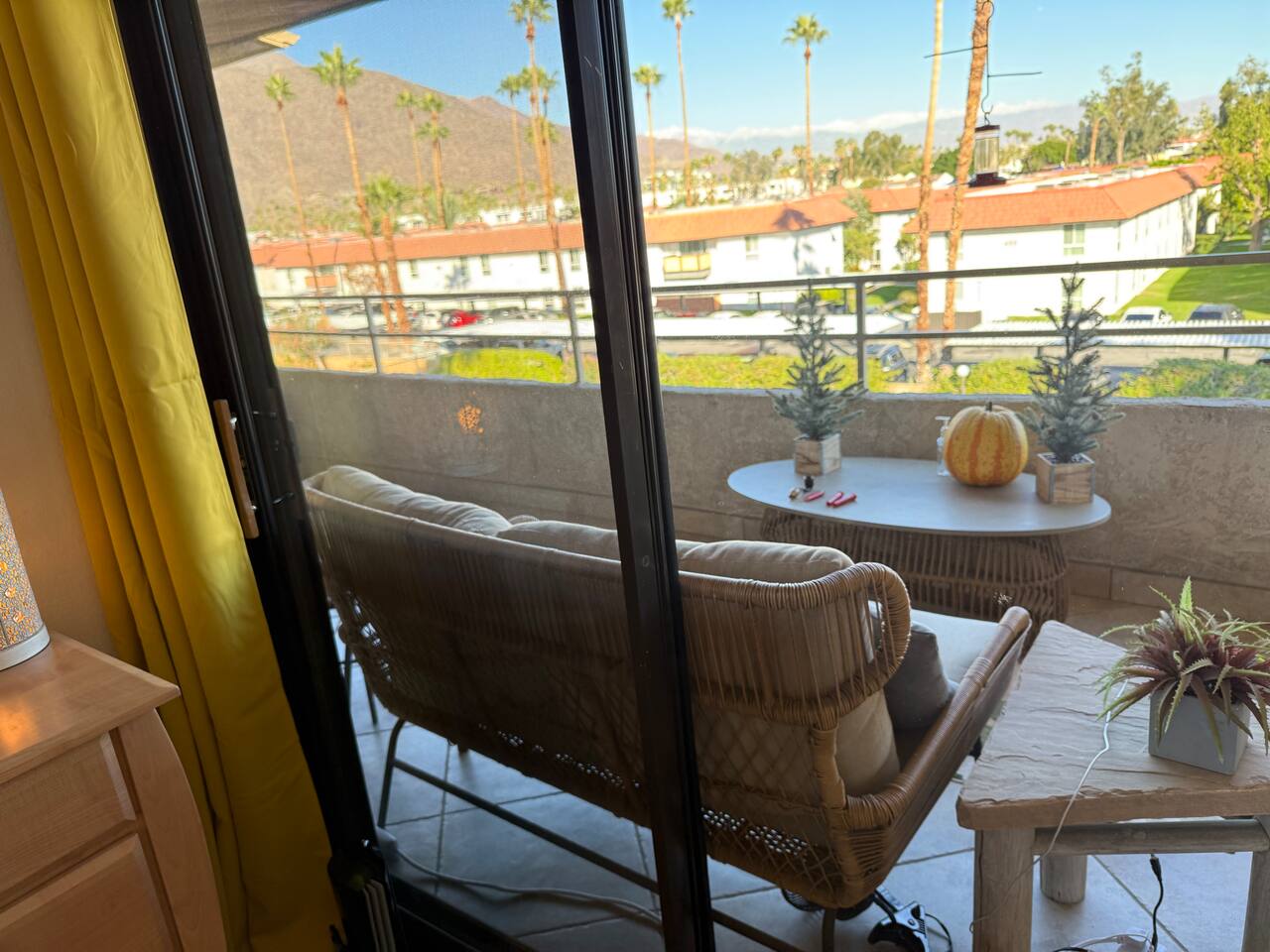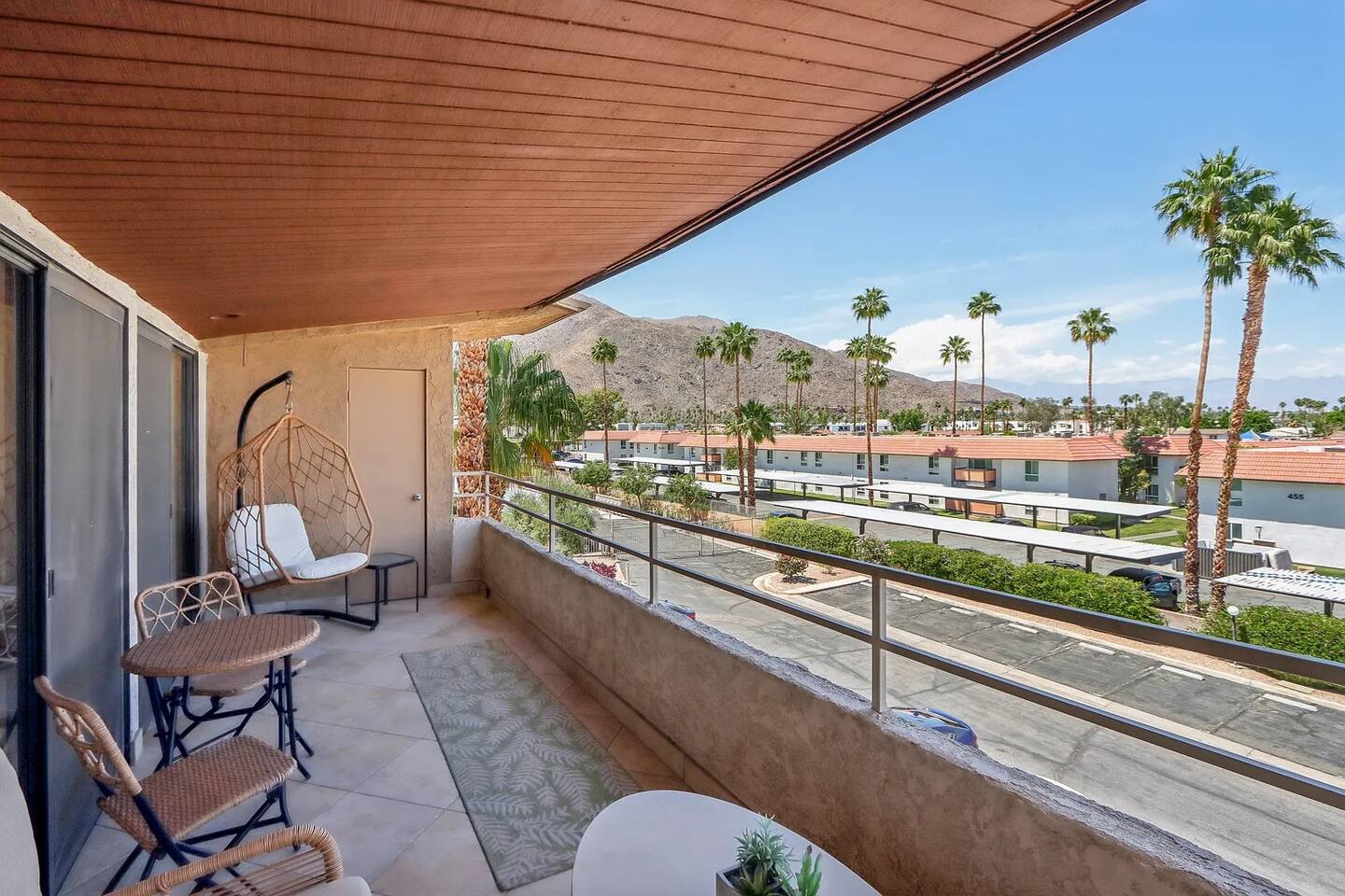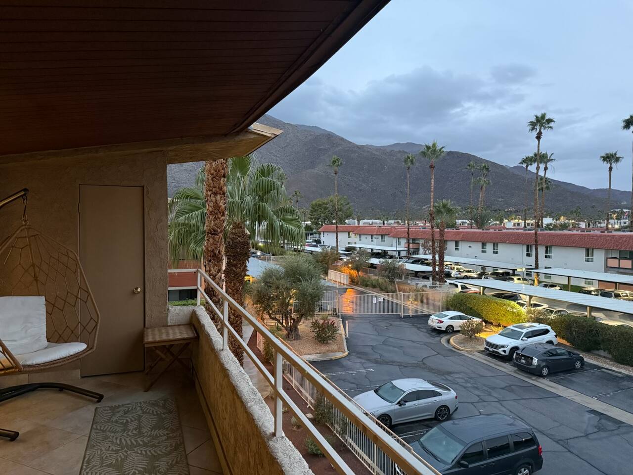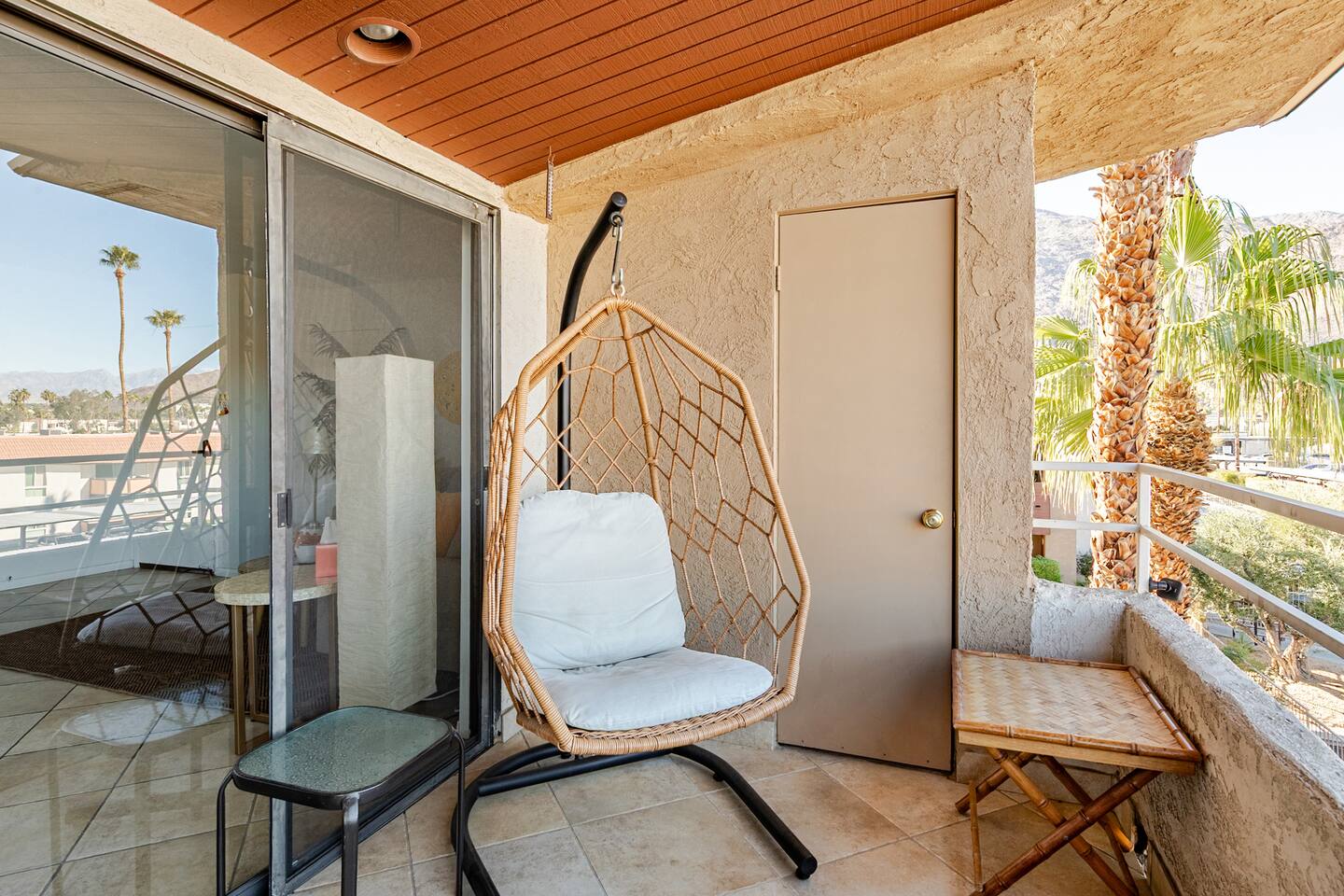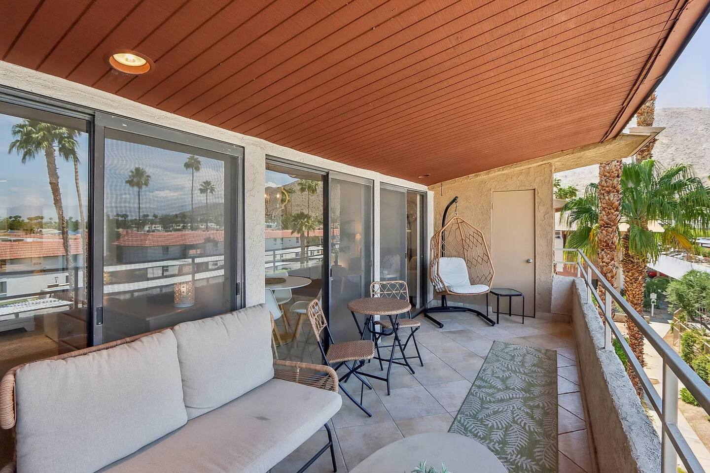 -This newly remodeled, top-level end-unit in The Biarritz has floor-to-ceiling windows & mirrors throughout, creating an open feel with extensive views of The San Jacinto Mountains and The Coachella Valley -The living area includes a sectional couch & smartTV, with a connected dining area featuring a beautiful midcentury modern inspired table & chairs - Sliding glass doors take you out to the balcony, which extends for the entire length of the unit. Here you'll find a hanging pod swing, a bistro table with two dining chairs, and a couch with a coffee table, so you can enjoy the expansive views in whichever way you like - The kitchen has been artfully remodeled and is equipped with new appliances (including a dishwasher) so you can create whatever meals you're inspired to cook during your stay - We also have a brand new Keurig & microwave if that's (understandably) the extent of your cooking desires while you're on vacation - The bedroom features a new King size bed, walk-in closet, floor-to-ceiling mirrors, a smartTV, and a gorgeous view of the San Jacinto mountains to wake up to in the morning (or afternoon) - The ensuite bathroom has been fully remodeled and features a large tiled shower with brass fixtures - The Biarritz has a large pool, two jacuzzis, and tennis courts available for your use.