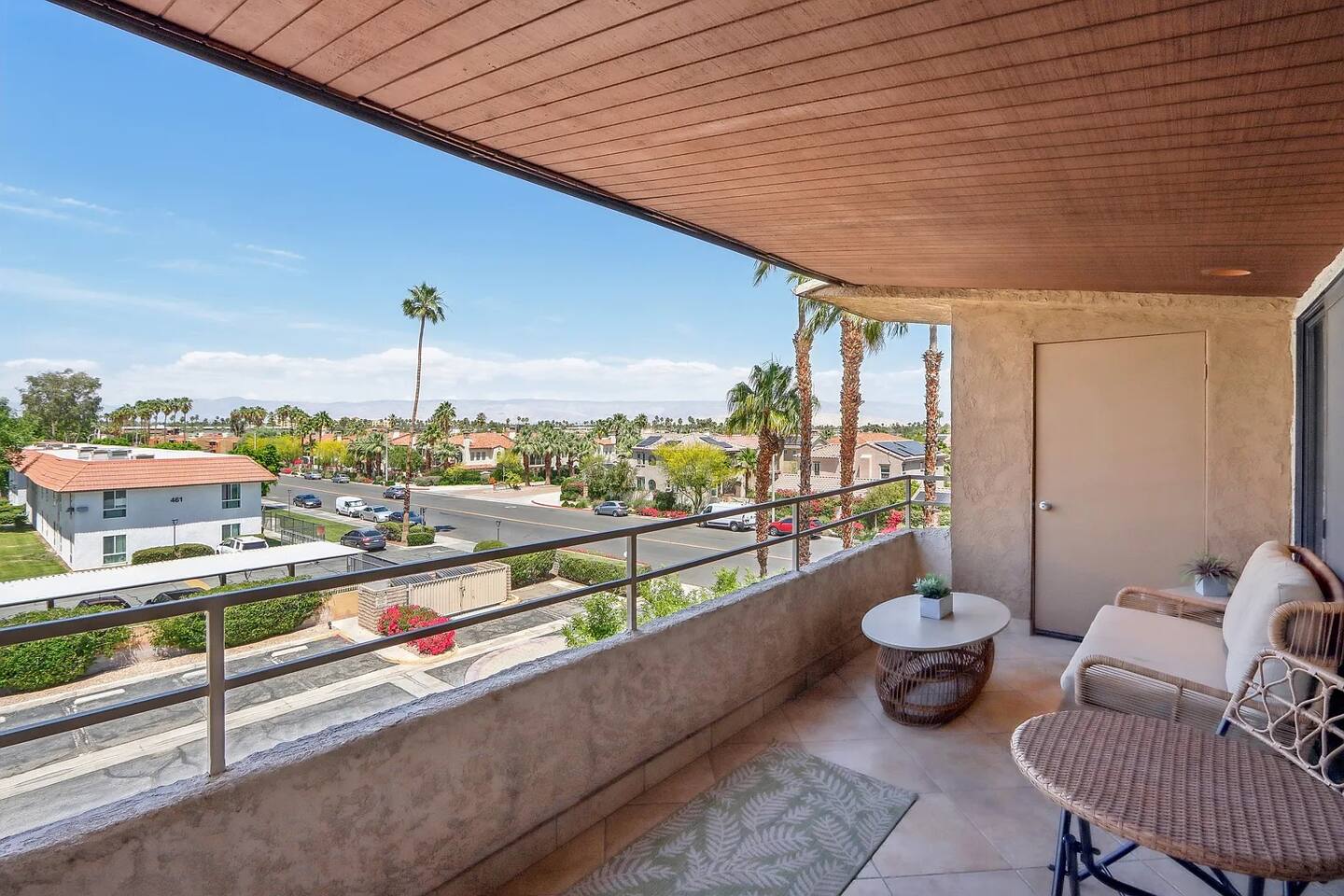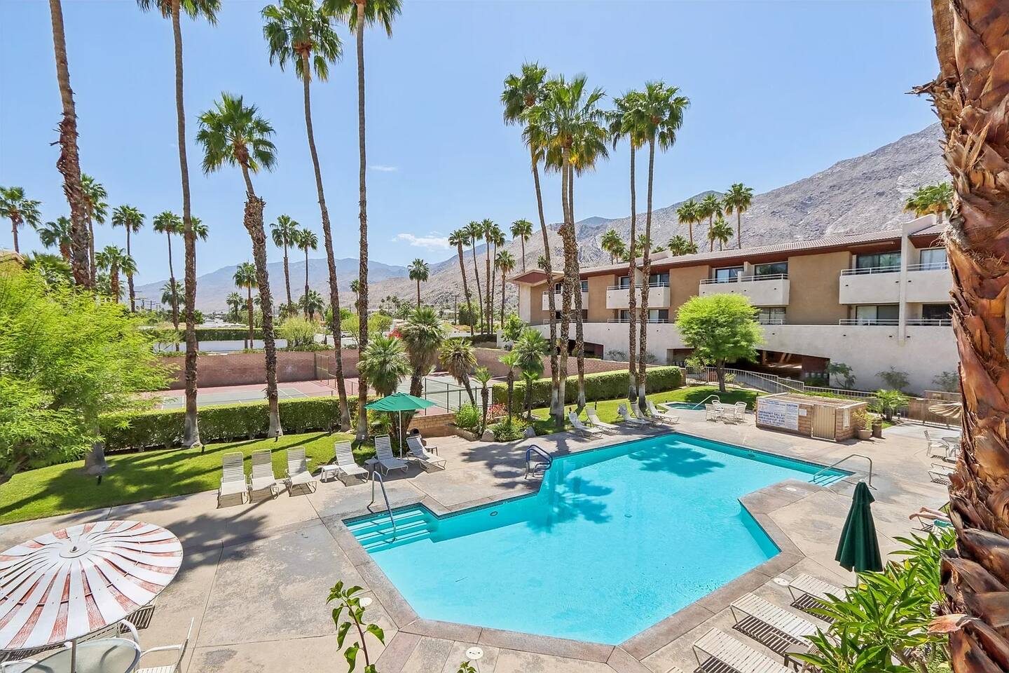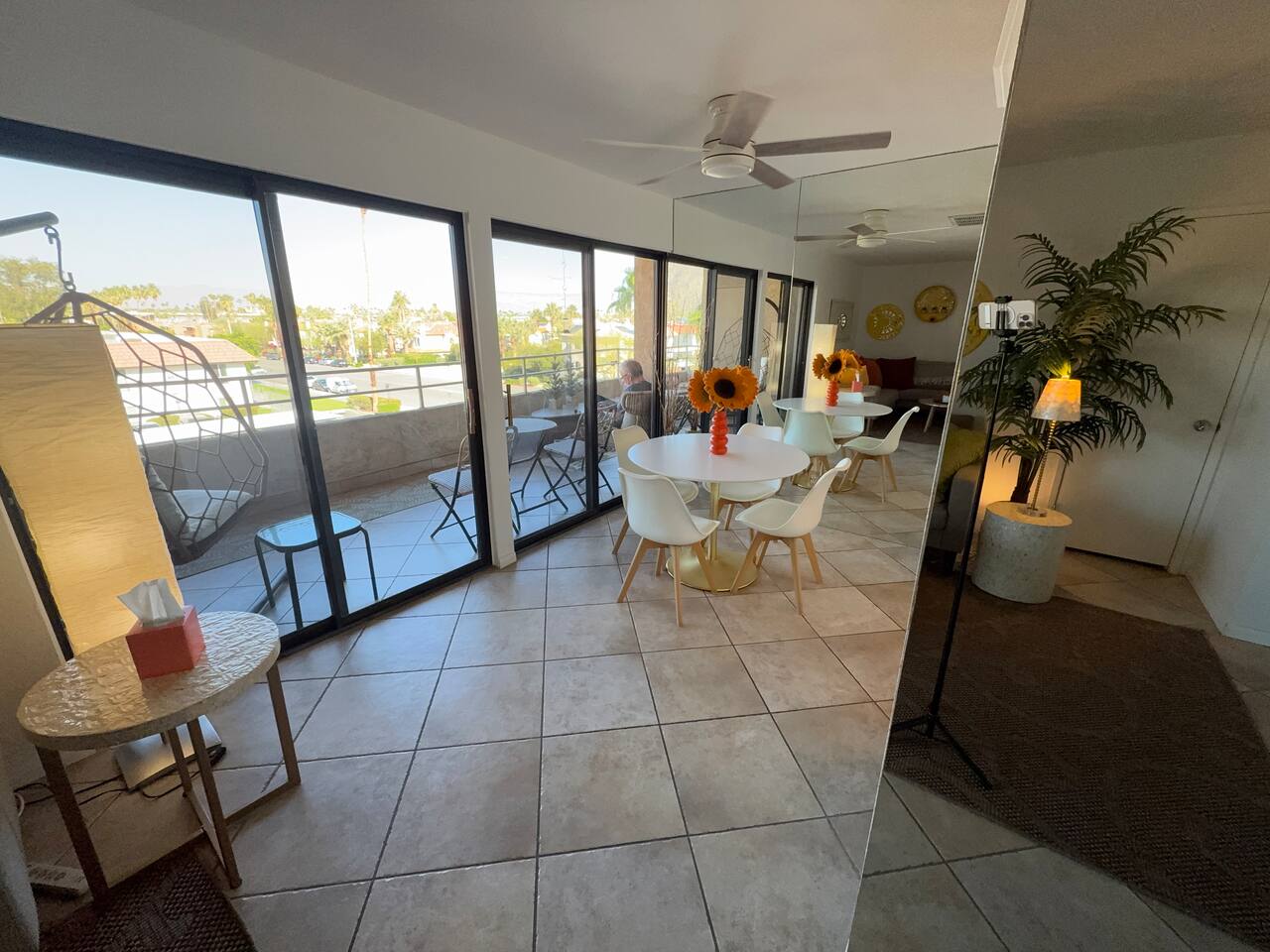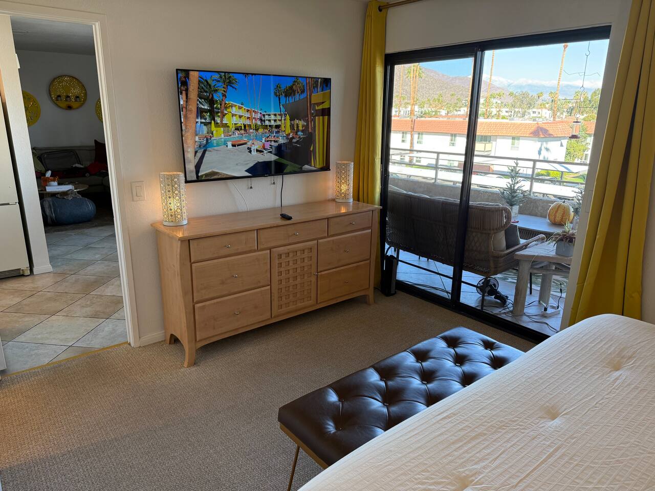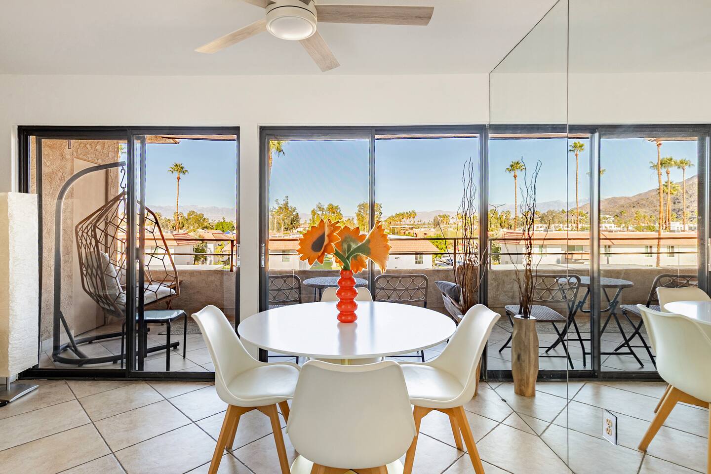 -This newly remodeled, top-level end-unit in The Biarritz has floor-to-ceiling windows & mirrors throughout, creating an open feel with extensive views of The San Jacinto Mountains and The Coachella Valley -The living area includes a sectional couch & smartTV, with a connected dining area featuring a beautiful midcentury modern inspired table & chairs - Sliding glass doors take you out to the balcony, which extends for the entire length of the unit. Here you'll find a hanging pod swing, a bistro table with two dining chairs, and a couch with a coffee table, so you can enjoy the expansive views in whichever way you like - The kitchen has been artfully remodeled and is equipped with new appliances (including a dishwasher) so you can create whatever meals you're inspired to cook during your stay - We also have a brand new Keurig & microwave if that's (understandably) the extent of your cooking desires while you're on vacation - The bedroom features a new King size bed, walk-in closet, floor-to-ceiling mirrors, a smartTV, and a gorgeous view of the San Jacinto mountains to wake up to in the morning (or afternoon) - The ensuite bathroom has been fully remodeled and features a large tiled shower with brass fixtures - The Biarritz has a large pool, two jacuzzis, and tennis courts available for your use.
