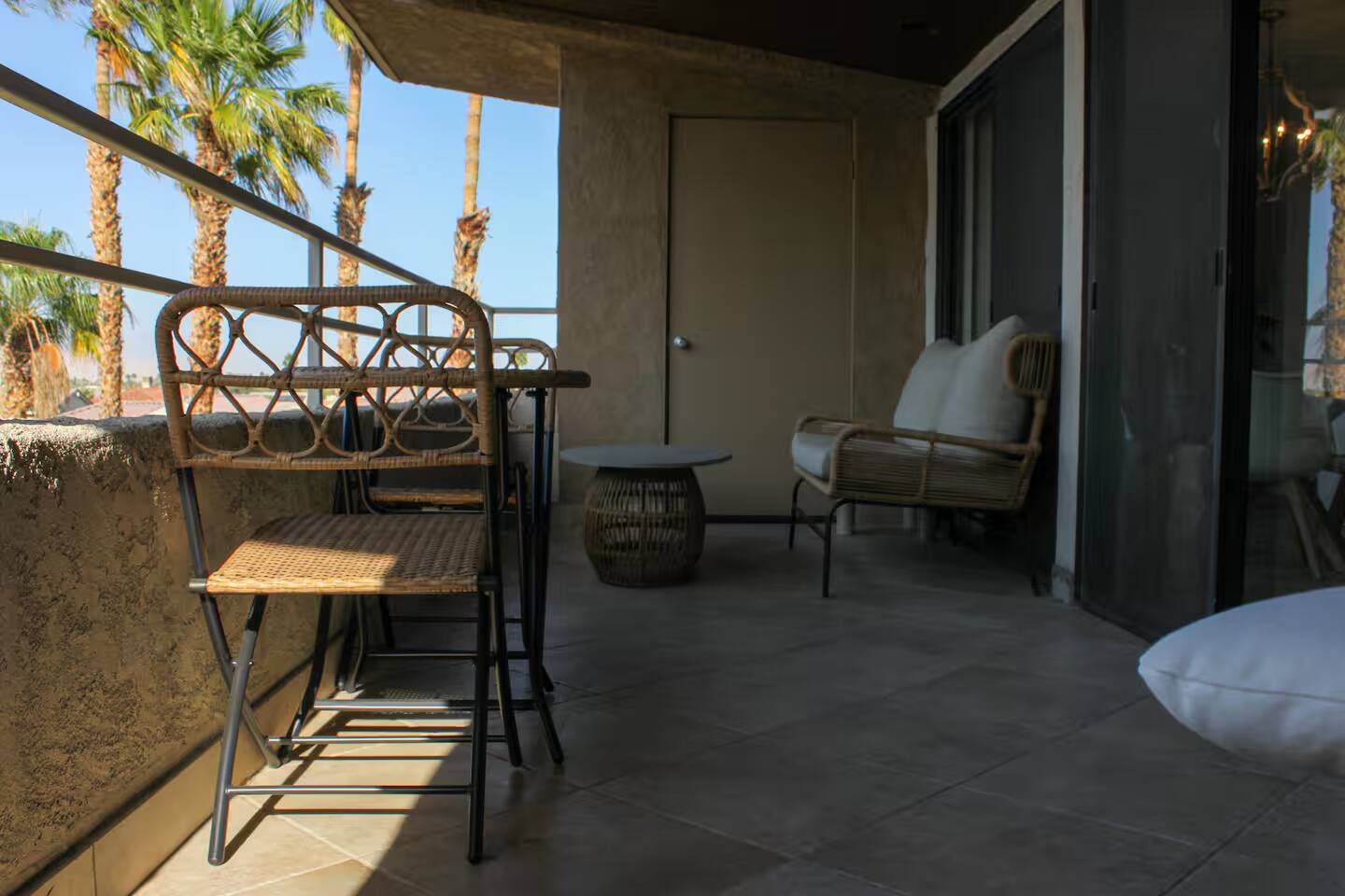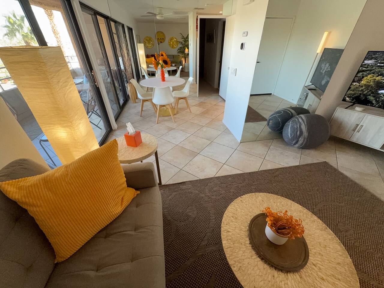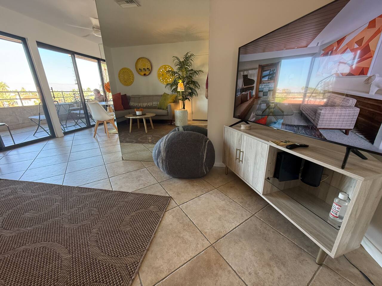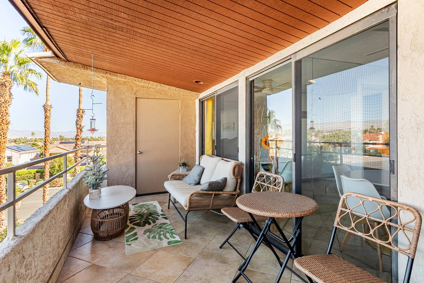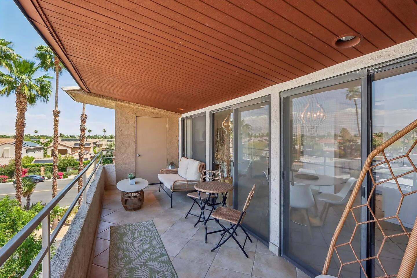 -This newly remodeled, top-level end-unit in The Biarritz has floor-to-ceiling windows & mirrors throughout, creating an open feel with extensive views of The San Jacinto Mountains and The Coachella Valley -The living area includes a sectional couch & smartTV, with a connected dining area featuring a beautiful midcentury modern inspired table & chairs - Sliding glass doors take you out to the balcony, which extends for the entire length of the unit. Here you'll find a hanging pod swing, a bistro table with two dining chairs, and a couch with a coffee table, so you can enjoy the expansive views in whichever way you like - The kitchen has been artfully remodeled and is equipped with new appliances (including a dishwasher) so you can create whatever meals you're inspired to cook during your stay - We also have a brand new Keurig & microwave if that's (understandably) the extent of your cooking desires while you're on vacation - The bedroom features a new King size bed, walk-in closet, floor-to-ceiling mirrors, a smartTV, and a gorgeous view of the San Jacinto mountains to wake up to in the morning (or afternoon) - The ensuite bathroom has been fully remodeled and features a large tiled shower with brass fixtures - The Biarritz has a large pool, two jacuzzis, and tennis courts available for your use.