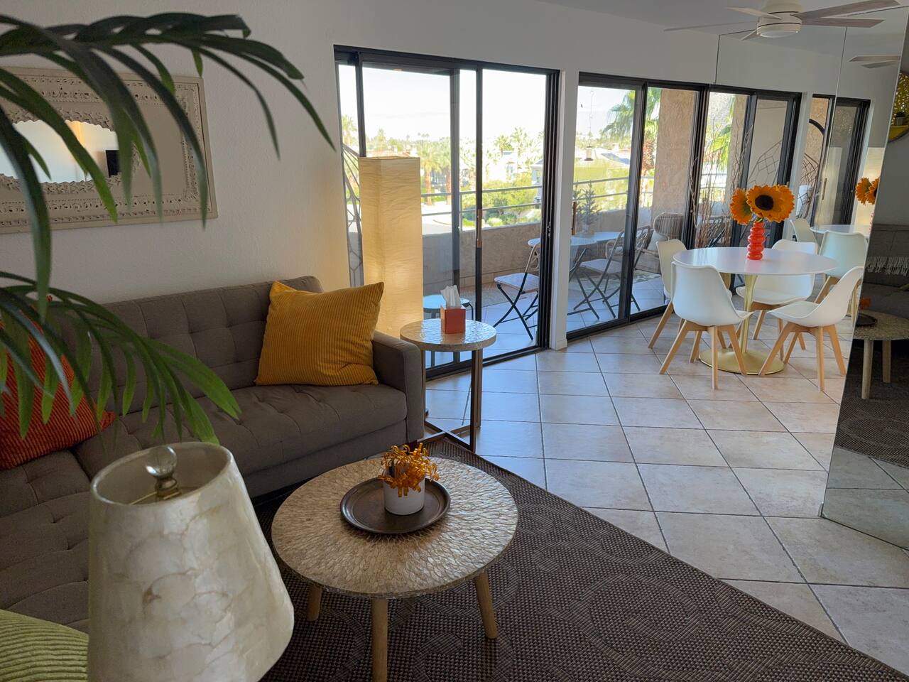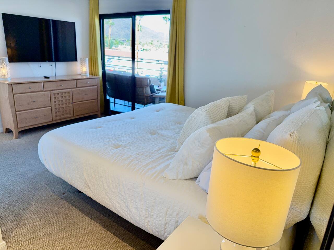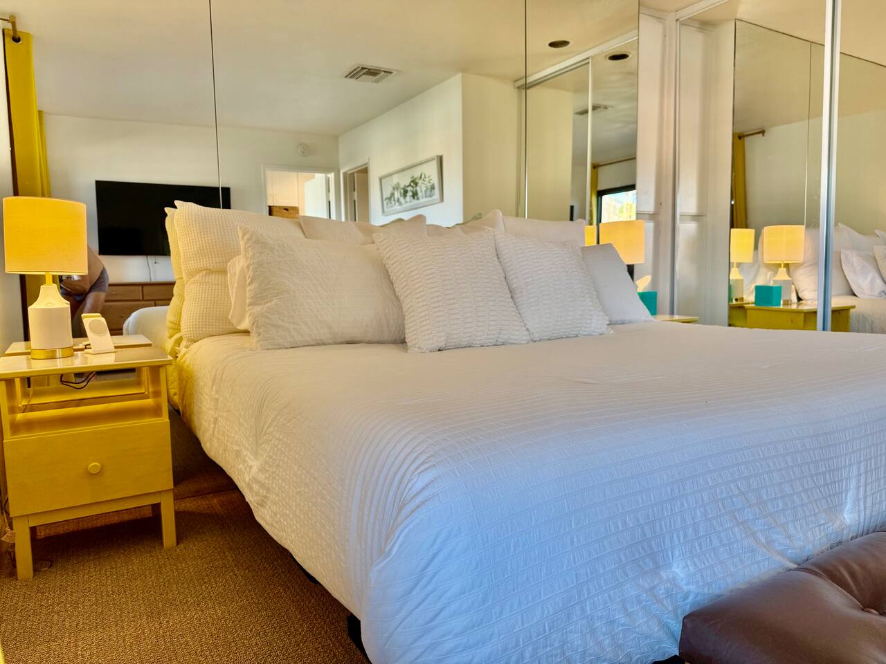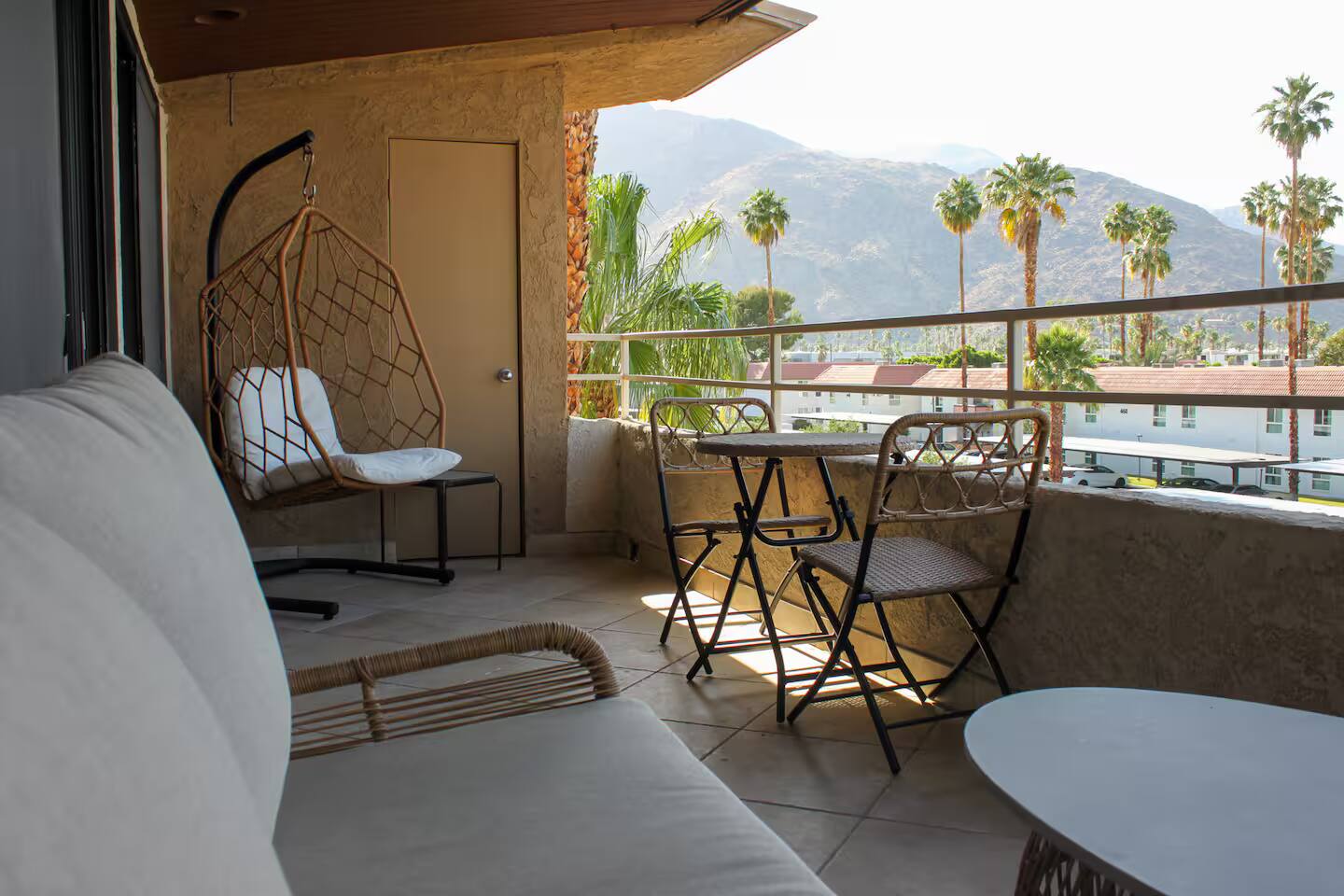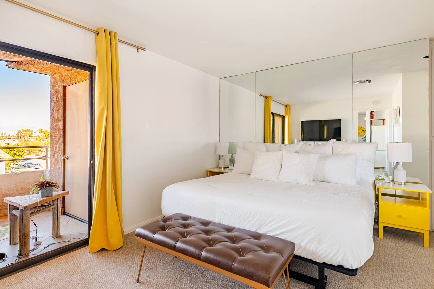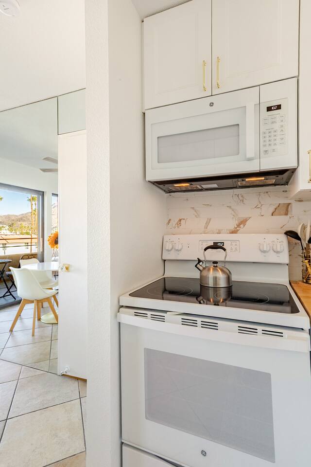 -This newly remodeled, top-level end-unit in The Biarritz has floor-to-ceiling windows & mirrors throughout, creating an open feel with extensive views of The San Jacinto Mountains and The Coachella Valley -The living area includes a sectional couch & smartTV, with a connected dining area featuring a beautiful midcentury modern inspired table & chairs - Sliding glass doors take you out to the balcony, which extends for the entire length of the unit. Here you'll find a hanging pod swing, a bistro table with two dining chairs, and a couch with a coffee table, so you can enjoy the expansive views in whichever way you like - The kitchen has been artfully remodeled and is equipped with new appliances (including a dishwasher) so you can create whatever meals you're inspired to cook during your stay - We also have a brand new Keurig & microwave if that's (understandably) the extent of your cooking desires while you're on vacation - The bedroom features a new King size bed, walk-in closet, floor-to-ceiling mirrors, a smartTV, and a gorgeous view of the San Jacinto mountains to wake up to in the morning (or afternoon) - The ensuite bathroom has been fully remodeled and features a large tiled shower with brass fixtures - The Biarritz has a large pool, two jacuzzis, and tennis courts available for your use.