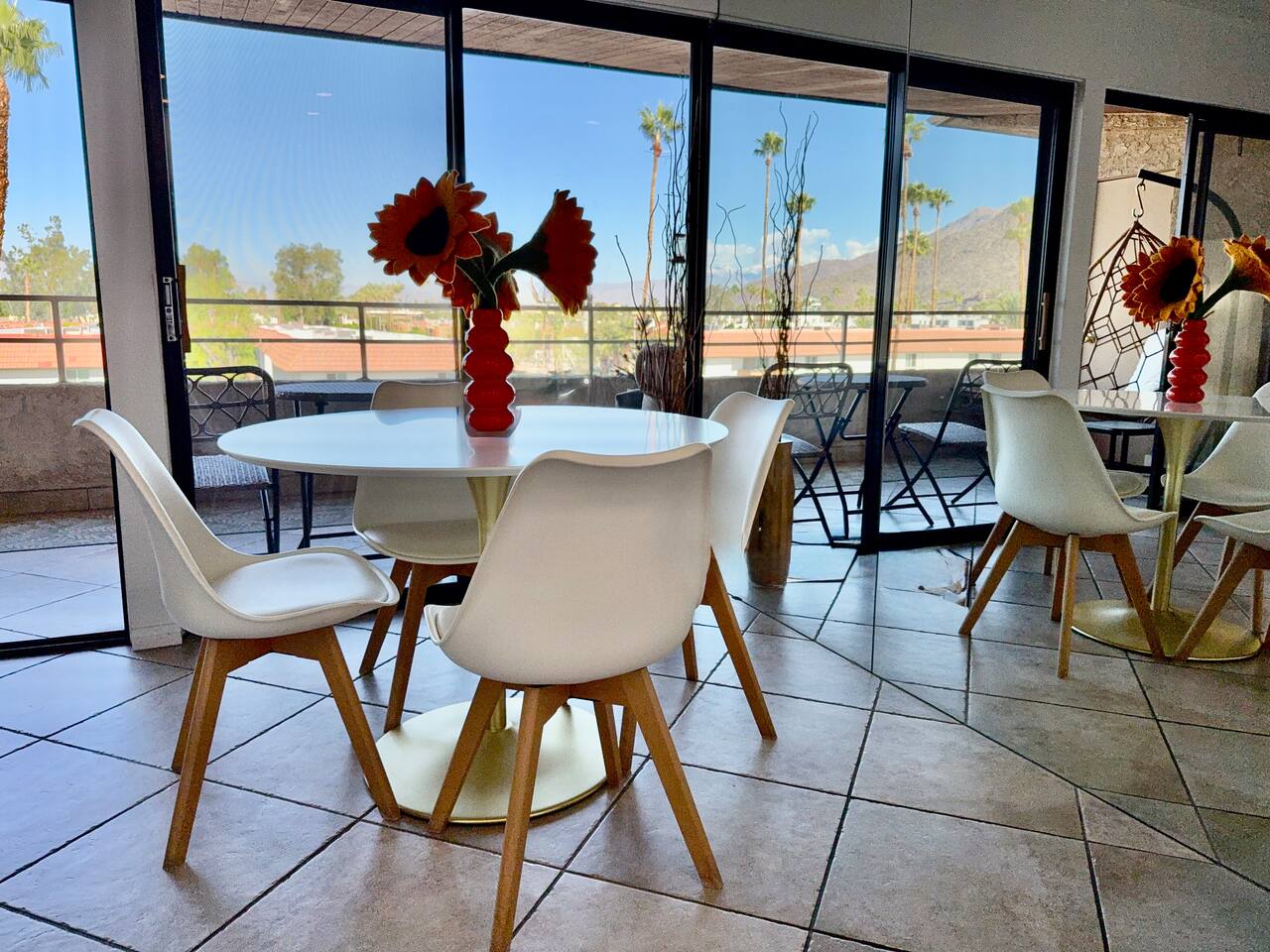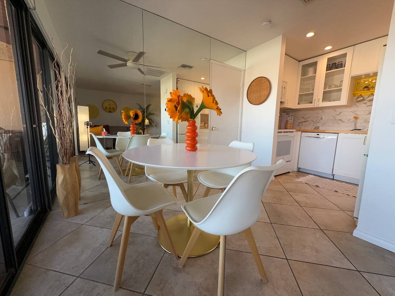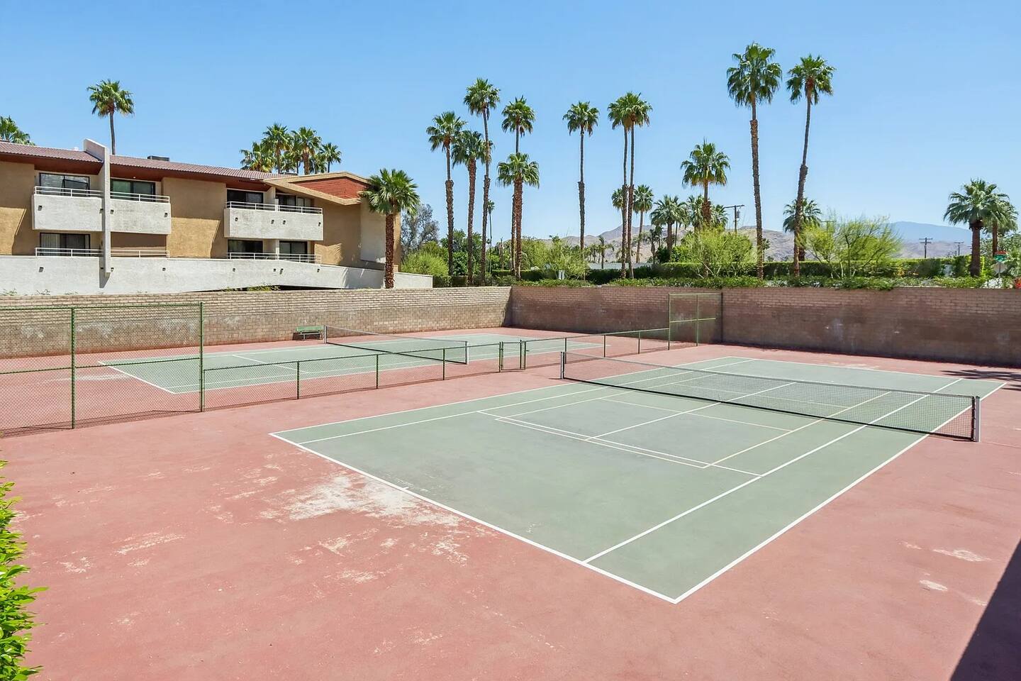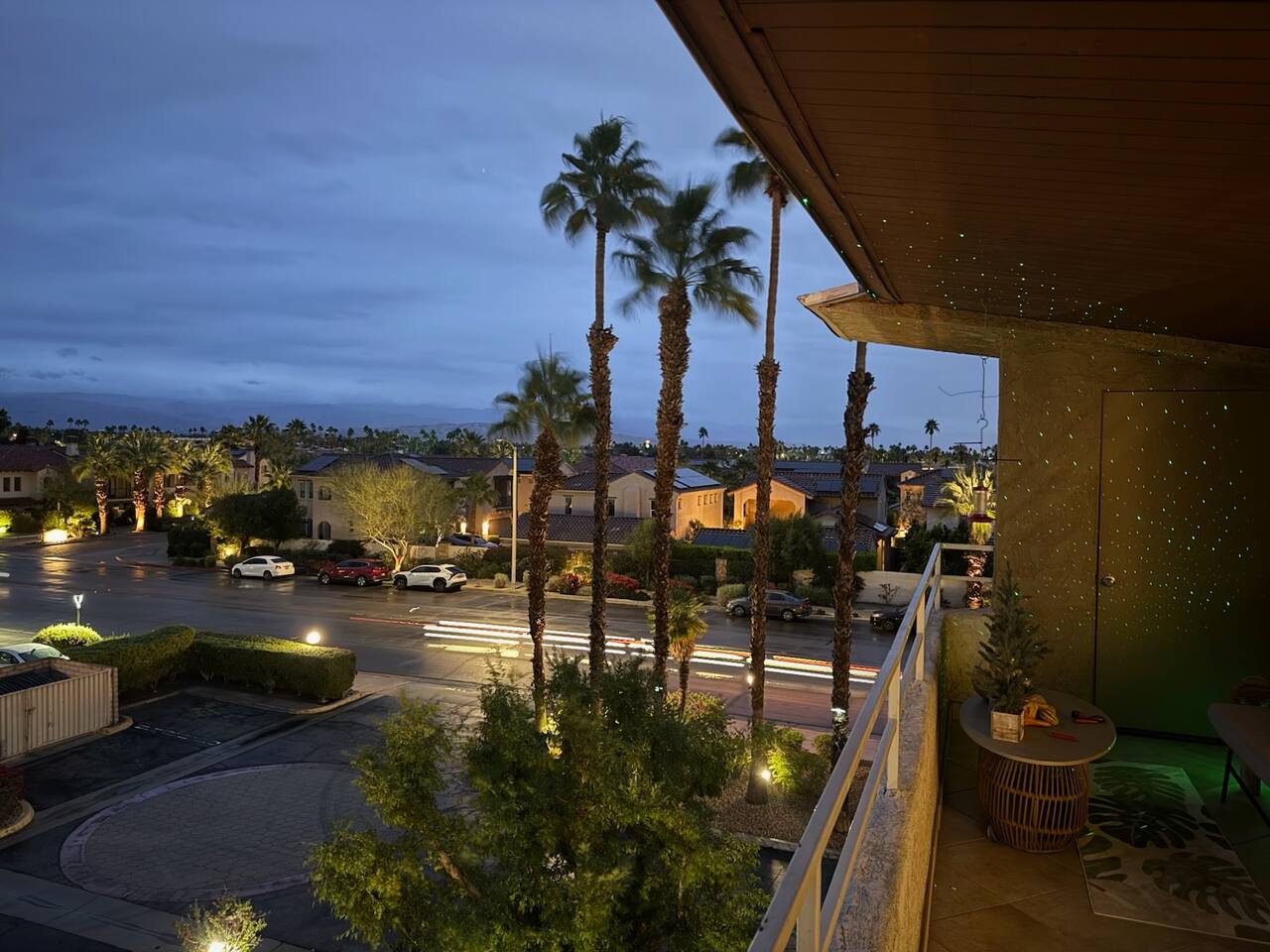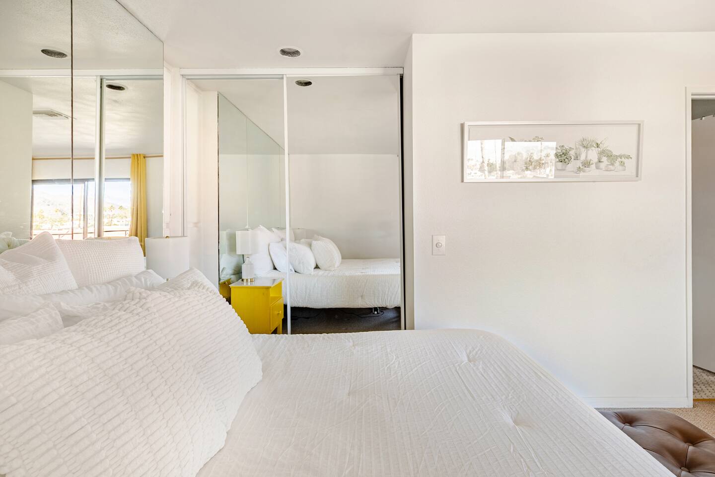 -This newly remodeled, top-level end-unit in The Biarritz has floor-to-ceiling windows & mirrors throughout, creating an open feel with extensive views of The San Jacinto Mountains and The Coachella Valley -The living area includes a sectional couch & smartTV, with a connected dining area featuring a beautiful midcentury modern inspired table & chairs - Sliding glass doors take you out to the balcony, which extends for the entire length of the unit. Here you'll find a hanging pod swing, a bistro table with two dining chairs, and a couch with a coffee table, so you can enjoy the expansive views in whichever way you like - The kitchen has been artfully remodeled and is equipped with new appliances (including a dishwasher) so you can create whatever meals you're inspired to cook during your stay - We also have a brand new Keurig & microwave if that's (understandably) the extent of your cooking desires while you're on vacation - The bedroom features a new King size bed, walk-in closet, floor-to-ceiling mirrors, a smartTV, and a gorgeous view of the San Jacinto mountains to wake up to in the morning (or afternoon) - The ensuite bathroom has been fully remodeled and features a large tiled shower with brass fixtures - The Biarritz has a large pool, two jacuzzis, and tennis courts available for your use.