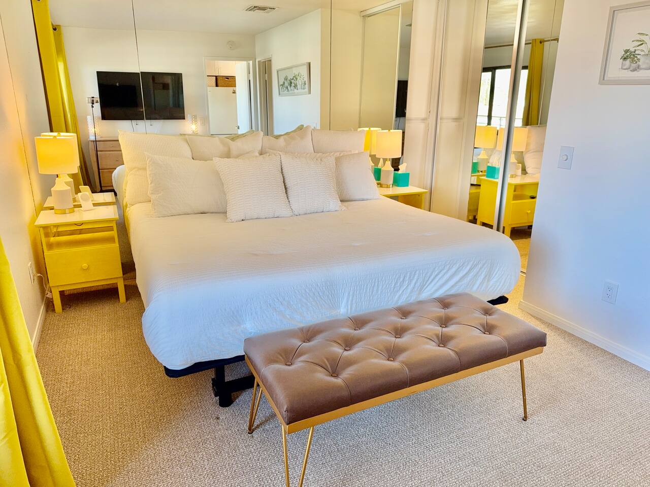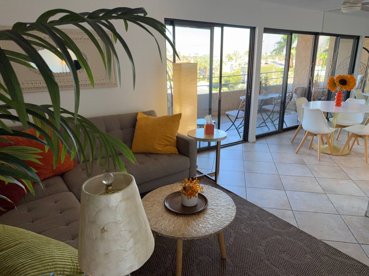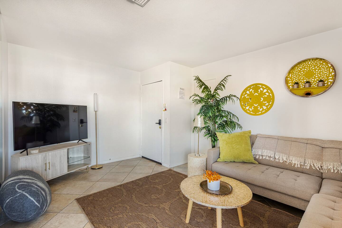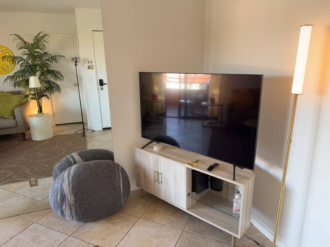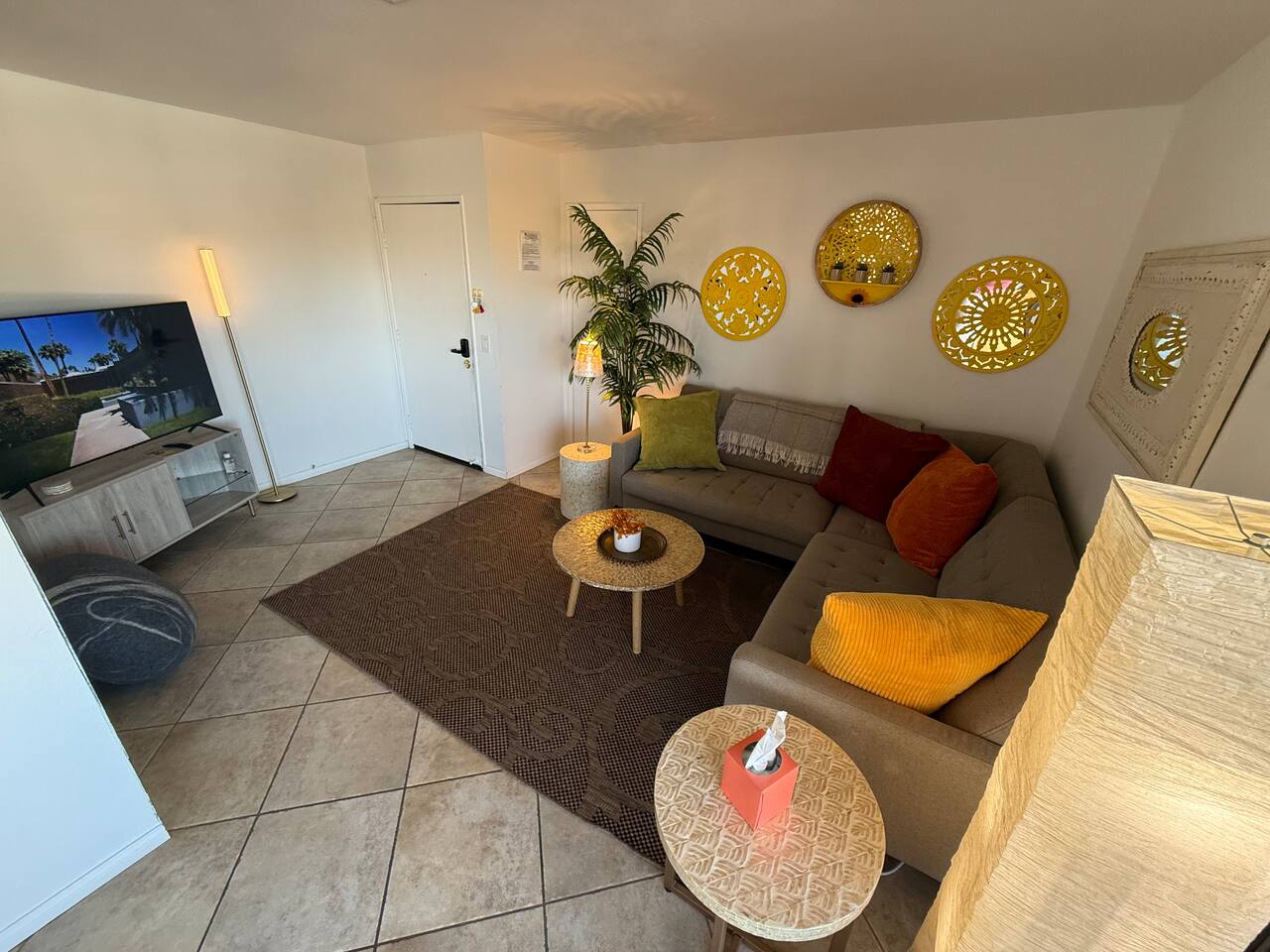 -This newly remodeled, top-level end-unit in The Biarritz has floor-to-ceiling windows & mirrors throughout, creating an open feel with extensive views of The San Jacinto Mountains and The Coachella Valley -The living area includes a sectional couch & smartTV, with a connected dining area featuring a beautiful midcentury modern inspired table & chairs - Sliding glass doors take you out to the balcony, which extends for the entire length of the unit. Here you'll find a hanging pod swing, a bistro table with two dining chairs, and a couch with a coffee table, so you can enjoy the expansive views in whichever way you like - The kitchen has been artfully remodeled and is equipped with new appliances (including a dishwasher) so you can create whatever meals you're inspired to cook during your stay - We also have a brand new Keurig & microwave if that's (understandably) the extent of your cooking desires while you're on vacation - The bedroom features a new King size bed, walk-in closet, floor-to-ceiling mirrors, a smartTV, and a gorgeous view of the San Jacinto mountains to wake up to in the morning (or afternoon) - The ensuite bathroom has been fully remodeled and features a large tiled shower with brass fixtures - The Biarritz has a large pool, two jacuzzis, and tennis courts available for your use.