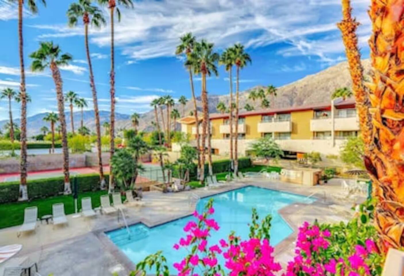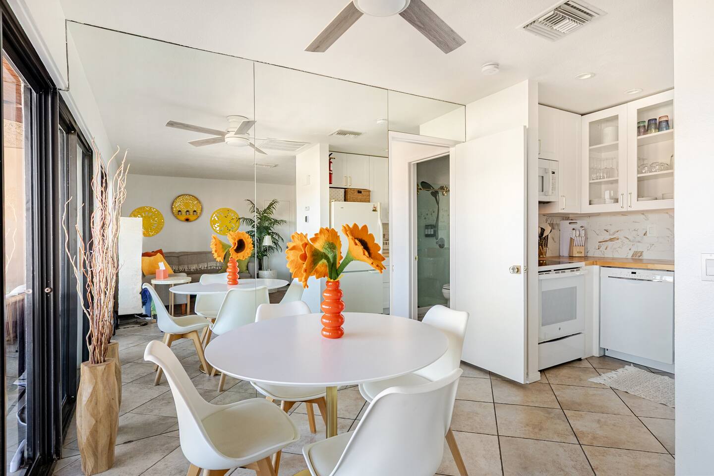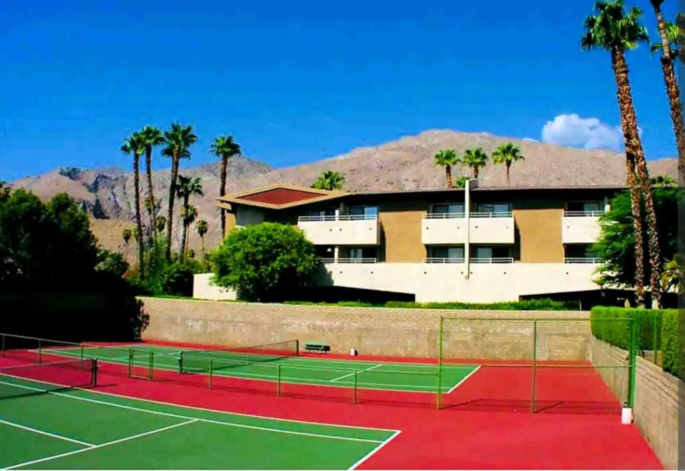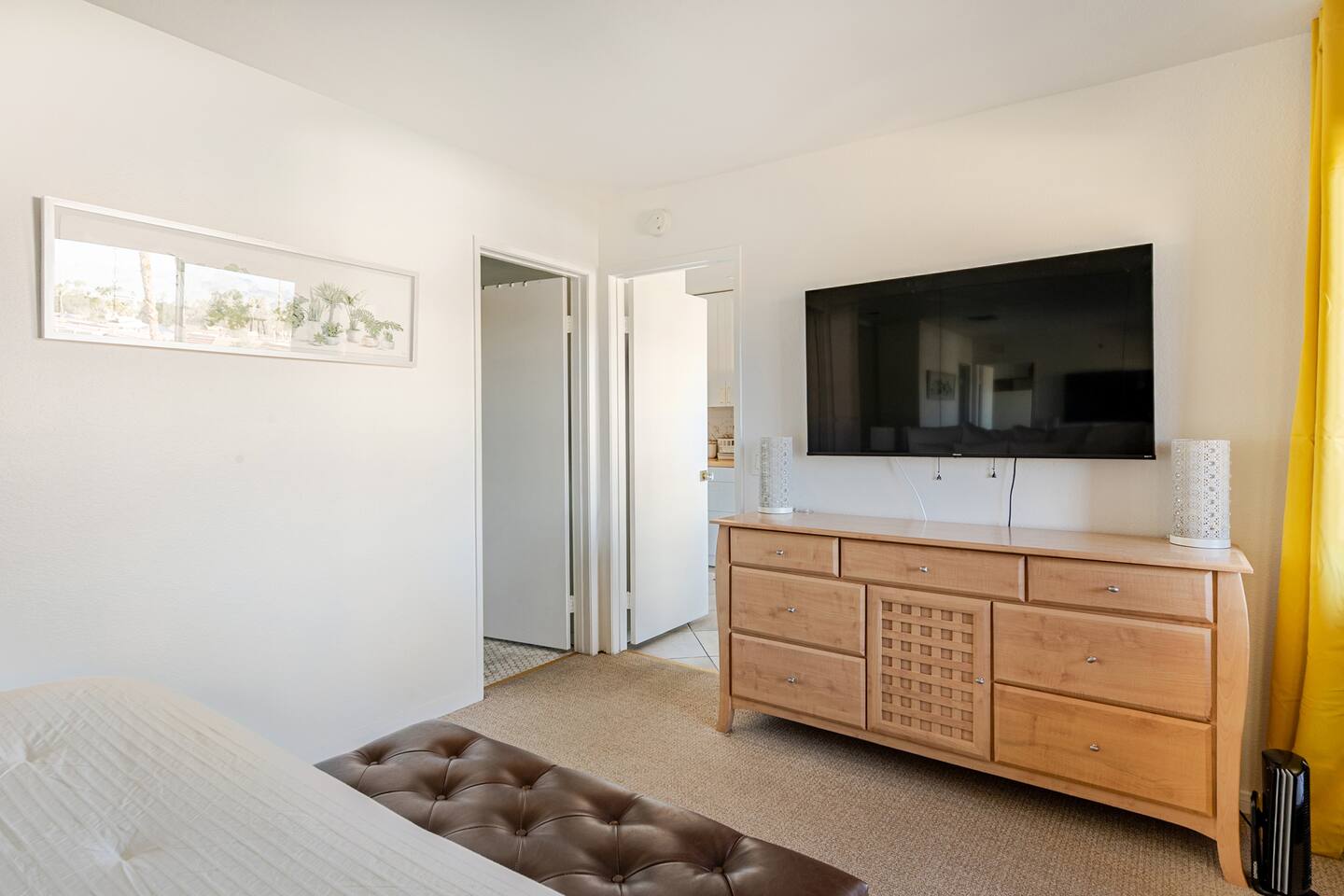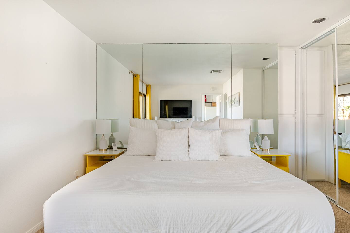 -This newly remodeled, top-level end-unit in The Biarritz has floor-to-ceiling windows & mirrors throughout, creating an open feel with extensive views of The San Jacinto Mountains and The Coachella Valley -The living area includes a sectional couch & smartTV, with a connected dining area featuring a beautiful midcentury modern inspired table & chairs - Sliding glass doors take you out to the balcony, which extends for the entire length of the unit. Here you'll find a hanging pod swing, a bistro table with two dining chairs, and a couch with a coffee table, so you can enjoy the expansive views in whichever way you like - The kitchen has been artfully remodeled and is equipped with new appliances (including a dishwasher) so you can create whatever meals you're inspired to cook during your stay - We also have a brand new Keurig & microwave if that's (understandably) the extent of your cooking desires while you're on vacation - The bedroom features a new King size bed, walk-in closet, floor-to-ceiling mirrors, a smartTV, and a gorgeous view of the San Jacinto mountains to wake up to in the morning (or afternoon) - The ensuite bathroom has been fully remodeled and features a large tiled shower with brass fixtures - The Biarritz has a large pool, two jacuzzis, and tennis courts available for your use.