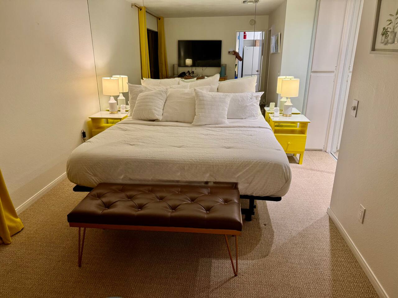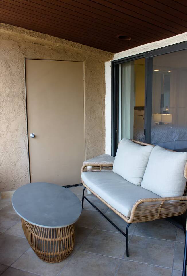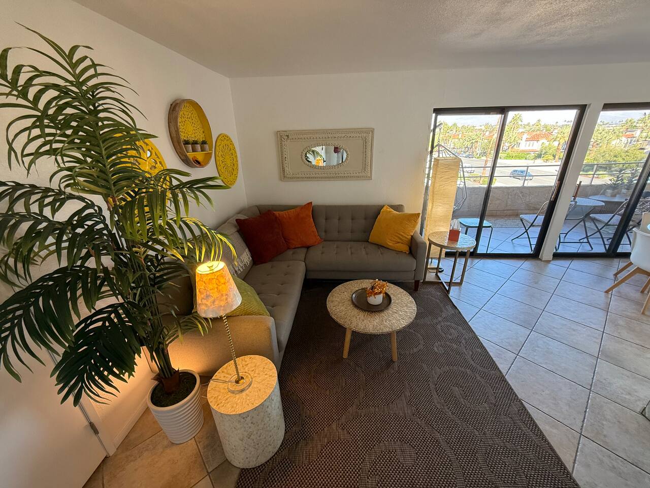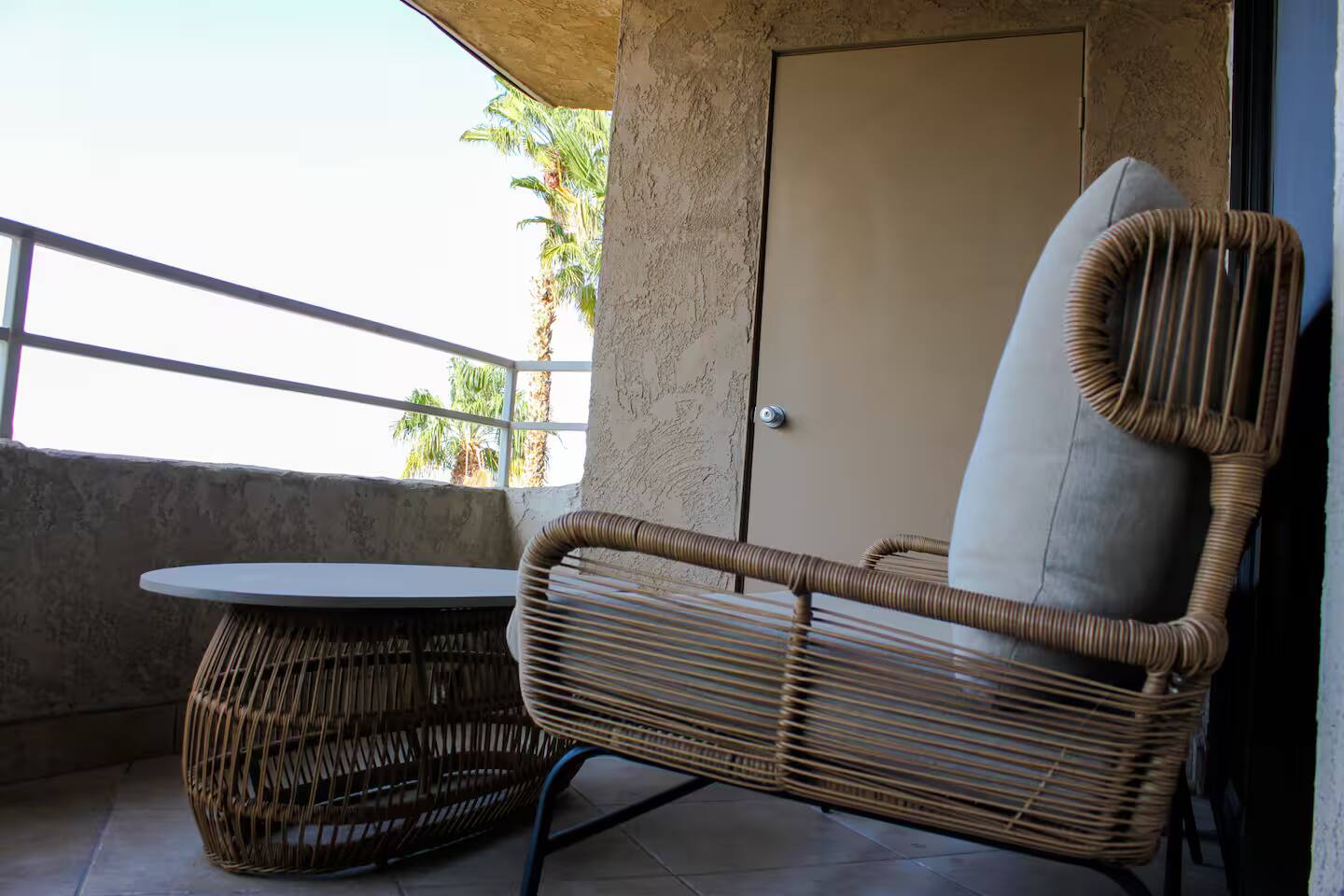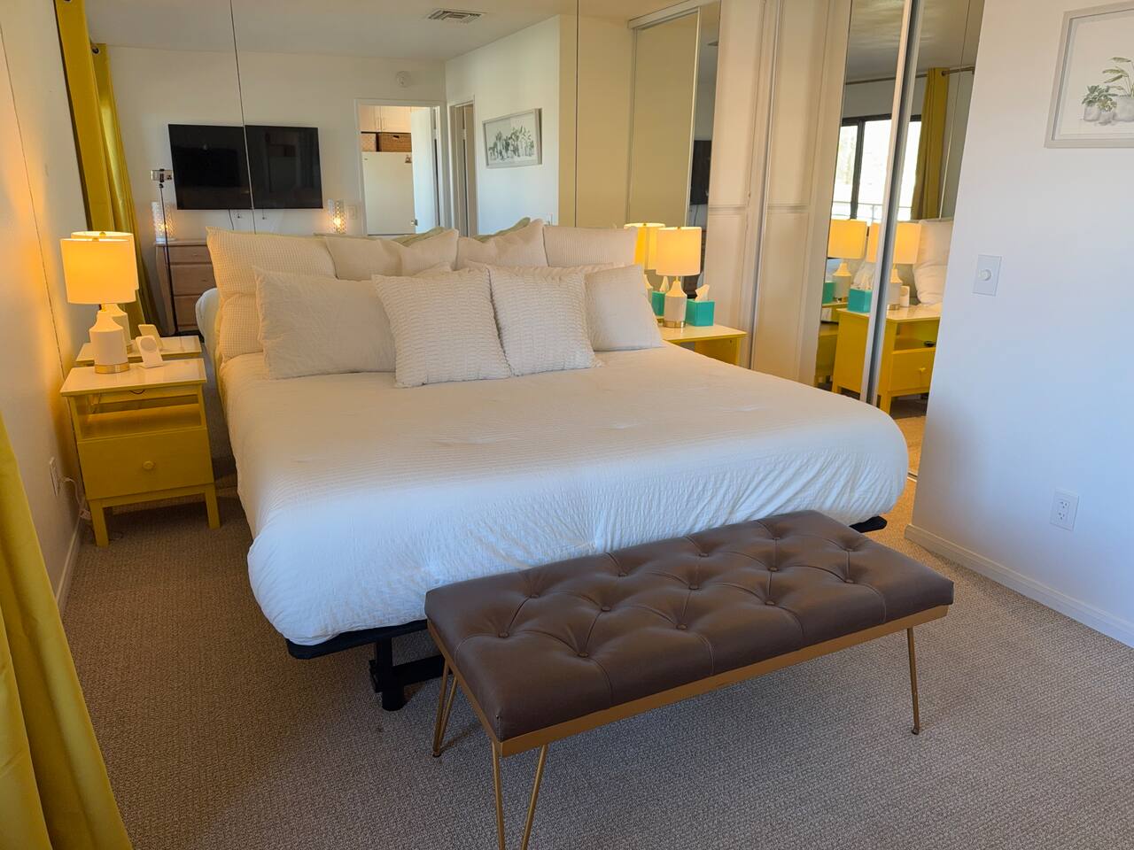 -This newly remodeled, top-level end-unit in The Biarritz has floor-to-ceiling windows & mirrors throughout, creating an open feel with extensive views of The San Jacinto Mountains and The Coachella Valley -The living area includes a sectional couch & smartTV, with a connected dining area featuring a beautiful midcentury modern inspired table & chairs - Sliding glass doors take you out to the balcony, which extends for the entire length of the unit. Here you'll find a hanging pod swing, a bistro table with two dining chairs, and a couch with a coffee table, so you can enjoy the expansive views in whichever way you like - The kitchen has been artfully remodeled and is equipped with new appliances (including a dishwasher) so you can create whatever meals you're inspired to cook during your stay - We also have a brand new Keurig & microwave if that's (understandably) the extent of your cooking desires while you're on vacation - The bedroom features a new King size bed, walk-in closet, floor-to-ceiling mirrors, a smartTV, and a gorgeous view of the San Jacinto mountains to wake up to in the morning (or afternoon) - The ensuite bathroom has been fully remodeled and features a large tiled shower with brass fixtures - The Biarritz has a large pool, two jacuzzis, and tennis courts available for your use.
