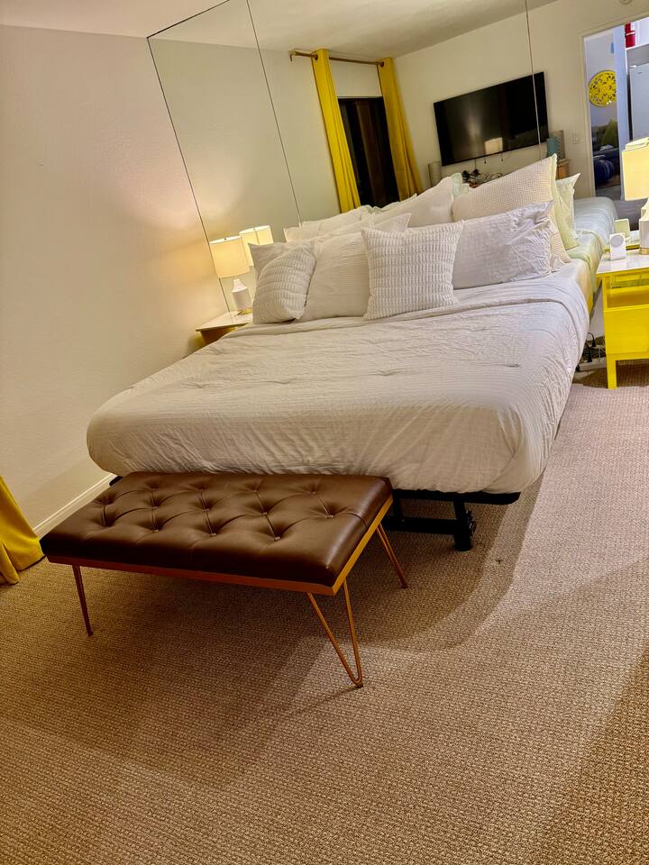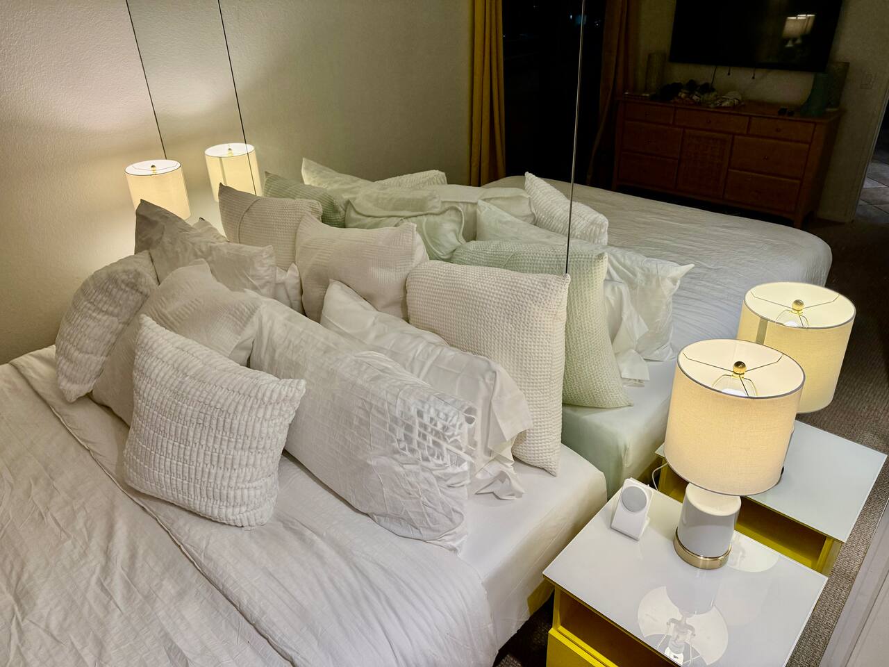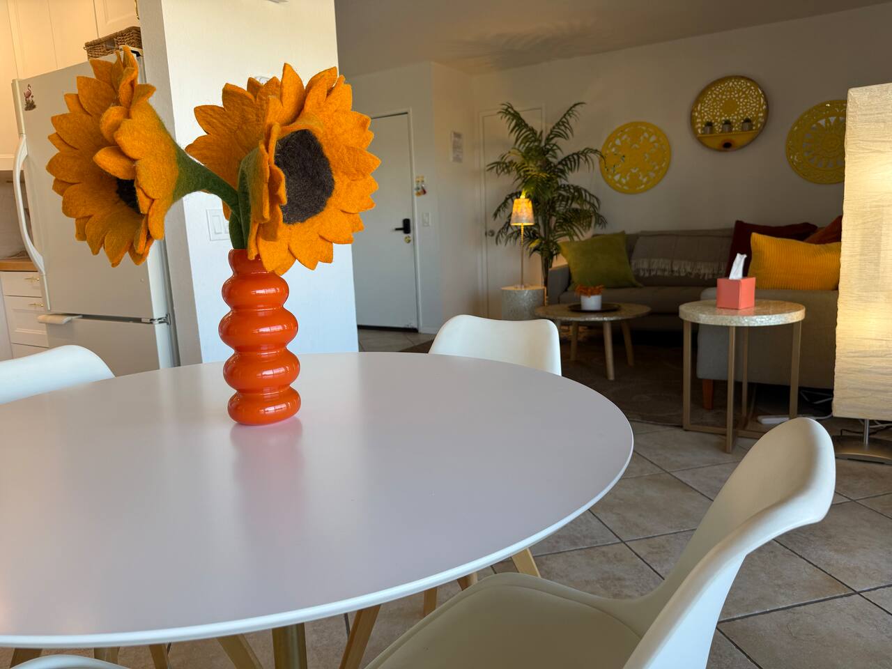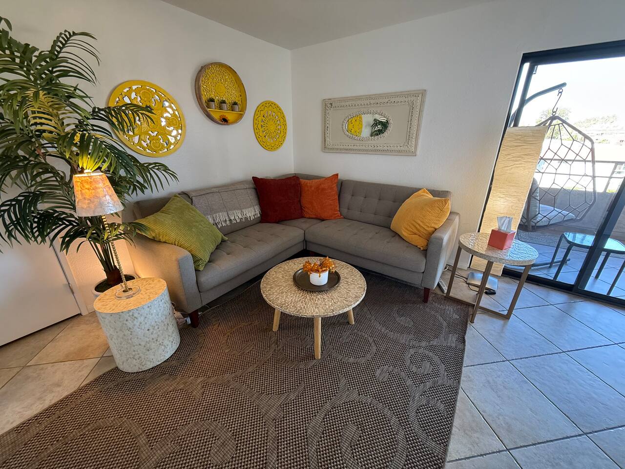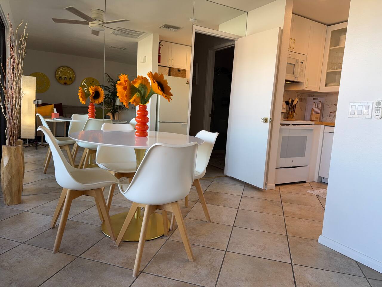 -This newly remodeled, top-level end-unit in The Biarritz has floor-to-ceiling windows & mirrors throughout, creating an open feel with extensive views of The San Jacinto Mountains and The Coachella Valley -The living area includes a sectional couch & smartTV, with a connected dining area featuring a beautiful midcentury modern inspired table & chairs - Sliding glass doors take you out to the balcony, which extends for the entire length of the unit. Here you'll find a hanging pod swing, a bistro table with two dining chairs, and a couch with a coffee table, so you can enjoy the expansive views in whichever way you like - The kitchen has been artfully remodeled and is equipped with new appliances (including a dishwasher) so you can create whatever meals you're inspired to cook during your stay - We also have a brand new Keurig & microwave if that's (understandably) the extent of your cooking desires while you're on vacation - The bedroom features a new King size bed, walk-in closet, floor-to-ceiling mirrors, a smartTV, and a gorgeous view of the San Jacinto mountains to wake up to in the morning (or afternoon) - The ensuite bathroom has been fully remodeled and features a large tiled shower with brass fixtures - The Biarritz has a large pool, two jacuzzis, and tennis courts available for your use.