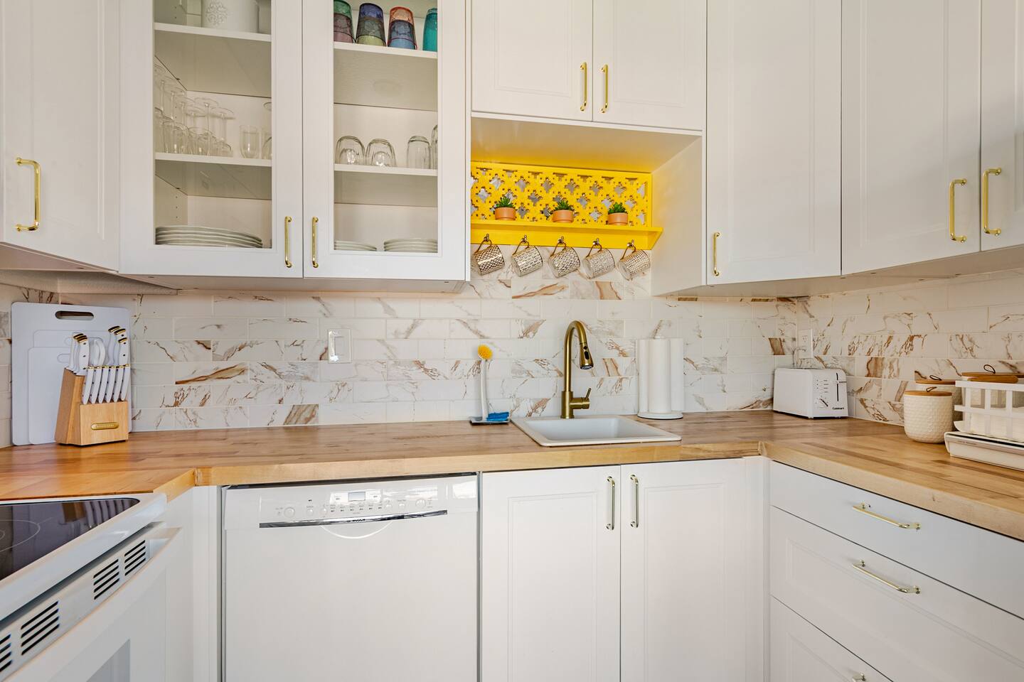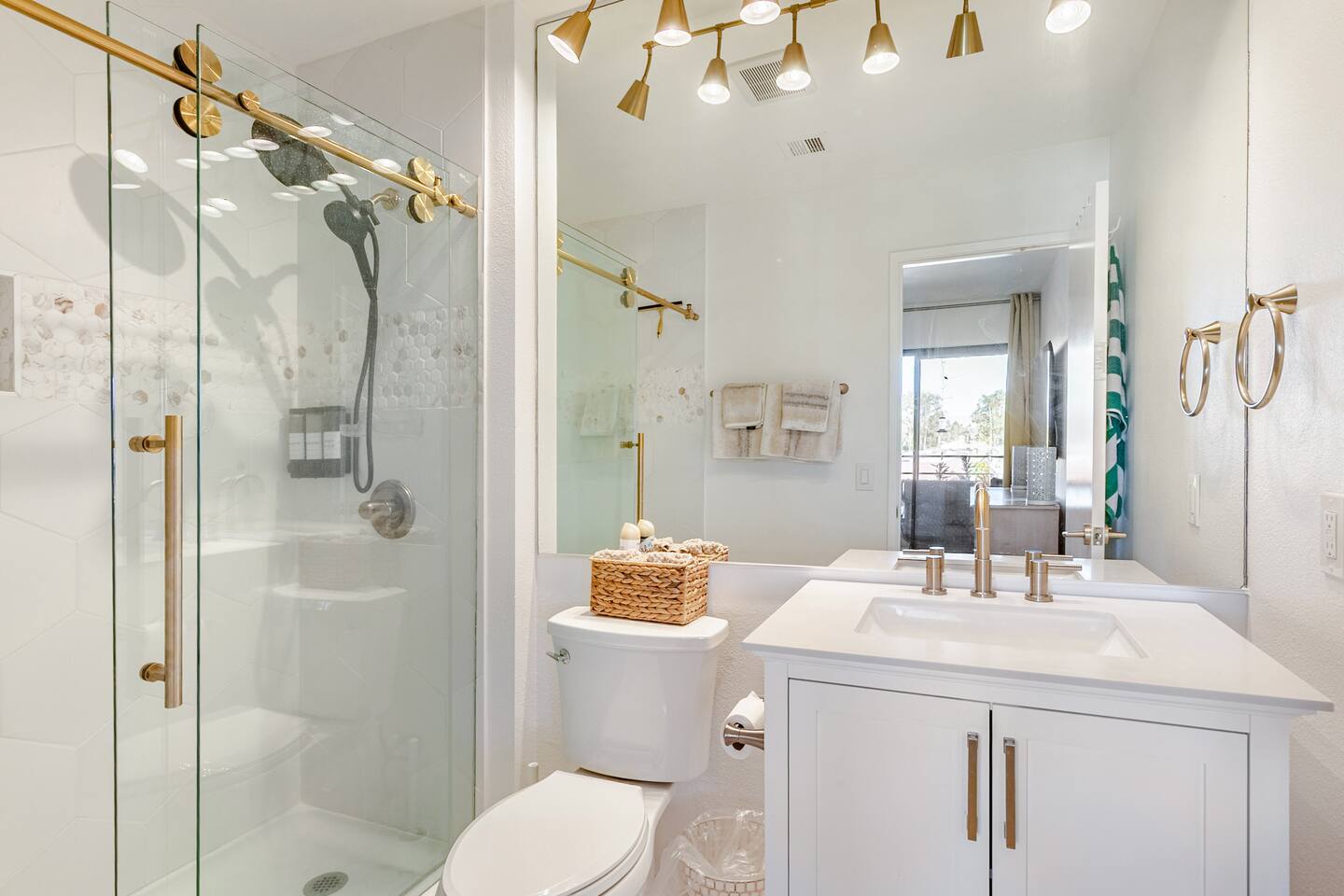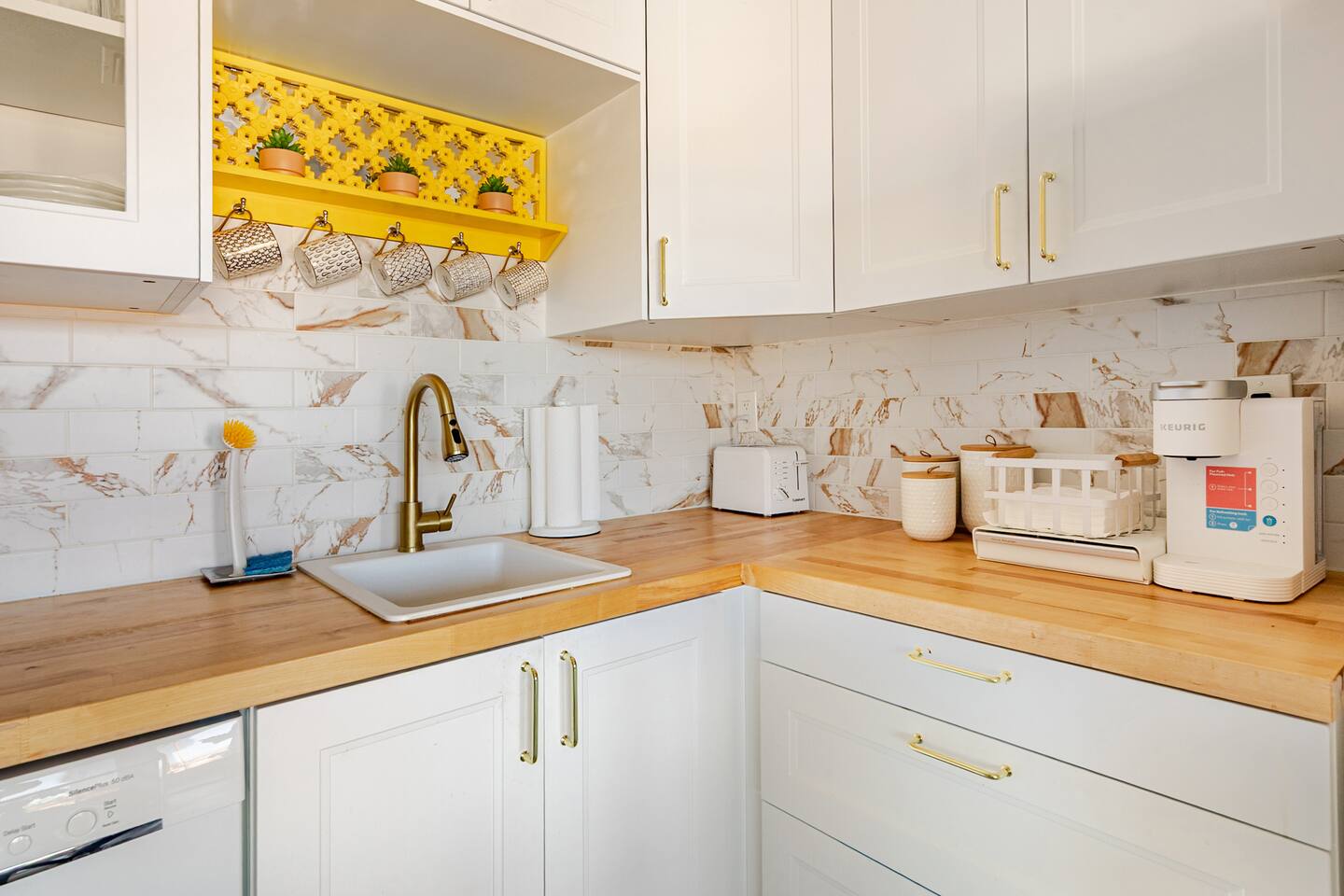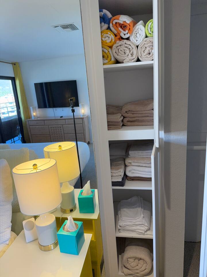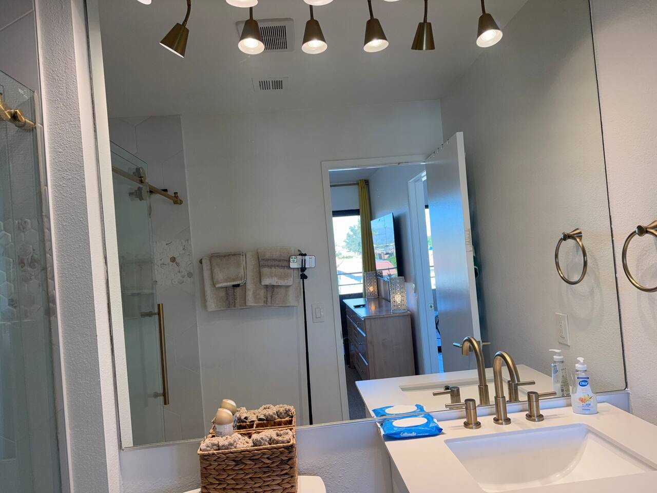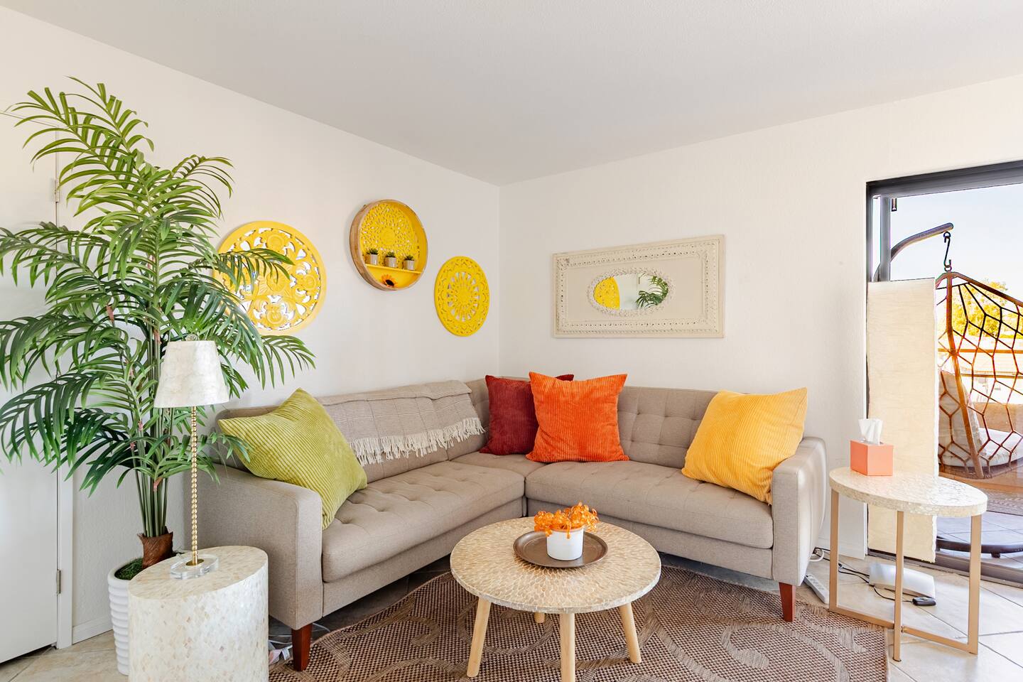 -This newly remodeled, top-level end-unit in The Biarritz has floor-to-ceiling windows & mirrors throughout, creating an open feel with extensive views of The San Jacinto Mountains and The Coachella Valley -The living area includes a sectional couch & smartTV, with a connected dining area featuring a beautiful midcentury modern inspired table & chairs - Sliding glass doors take you out to the balcony, which extends for the entire length of the unit. Here you'll find a hanging pod swing, a bistro table with two dining chairs, and a couch with a coffee table, so you can enjoy the expansive views in whichever way you like - The kitchen has been artfully remodeled and is equipped with new appliances (including a dishwasher) so you can create whatever meals you're inspired to cook during your stay - We also have a brand new Keurig & microwave if that's (understandably) the extent of your cooking desires while you're on vacation - The bedroom features a new King size bed, walk-in closet, floor-to-ceiling mirrors, a smartTV, and a gorgeous view of the San Jacinto mountains to wake up to in the morning (or afternoon) - The ensuite bathroom has been fully remodeled and features a large tiled shower with brass fixtures - The Biarritz has a large pool, two jacuzzis, and tennis courts available for your use.